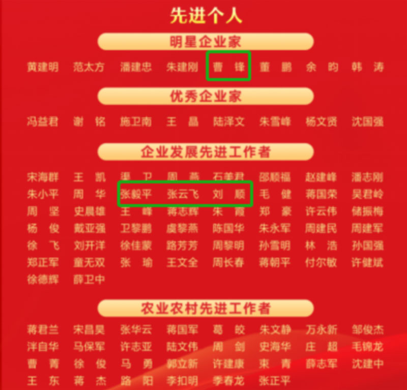 總經理曹鋒榮獲“明星企業家”稱號,副總經理張毅平、人力綜合部部長張云飛、營銷部副部長劉順榮獲“企業發展先進工作者”稱號。